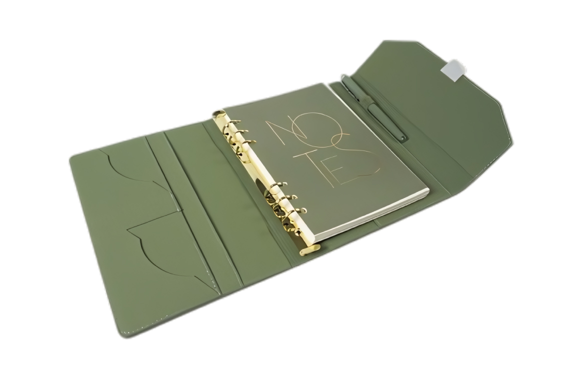 An embossed leather folder with initials delivers a polished impression in meetings or presentations.