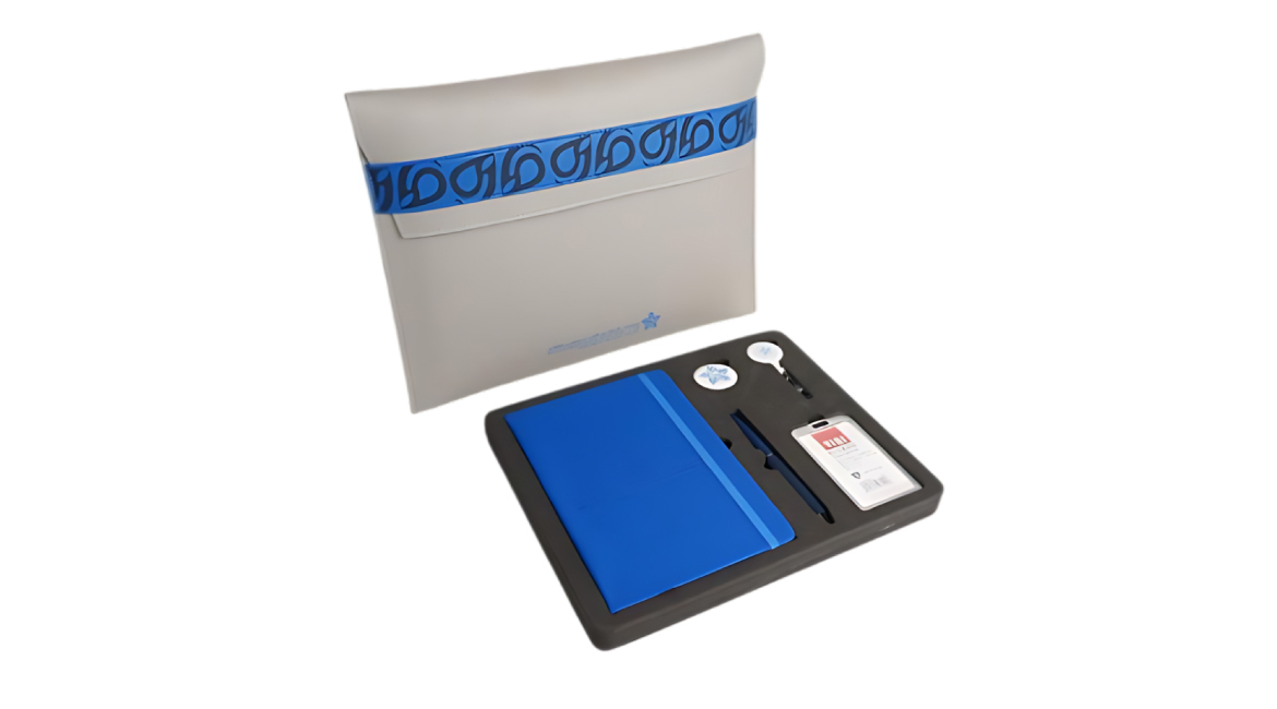 One excellent example is a Curated Business Gift Set, designed to combine functionality with sophistication. It includes a Premium Notebook, a Sleek Folder or Document Pouch, a Clear Acrylic ID Badge, a Retractable Badge Holder, and a High-Quality Pen. Each item is arranged in an elegant pouch or box, making it a perfect choice for company events, conferences, or welcoming new team members. The presentation feels polished and thoughtful, ensuring every recipient experiences both value and pride in receiving it.