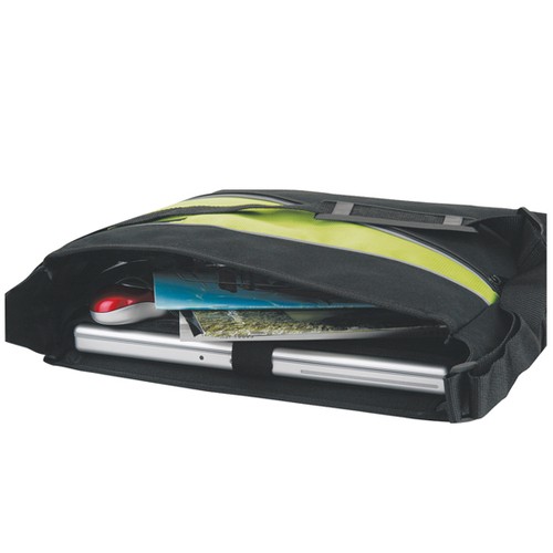 - A sturdy, eye-catching messenger bag made of 600-denier polyester with reflective piping and an accent panel in your choice of four bold colors.