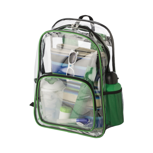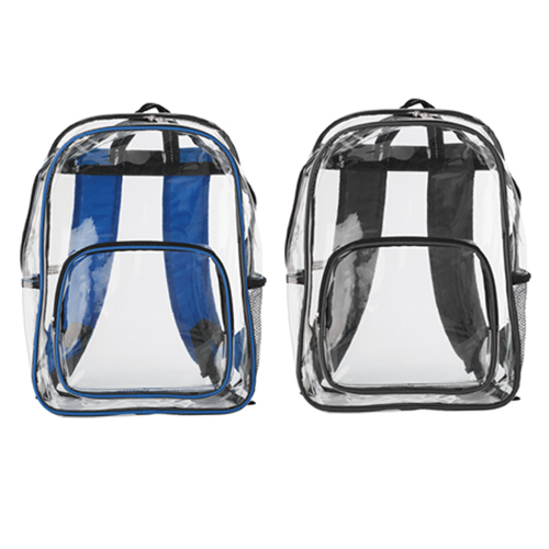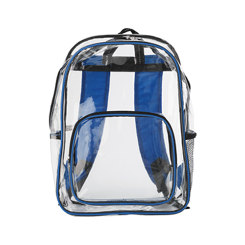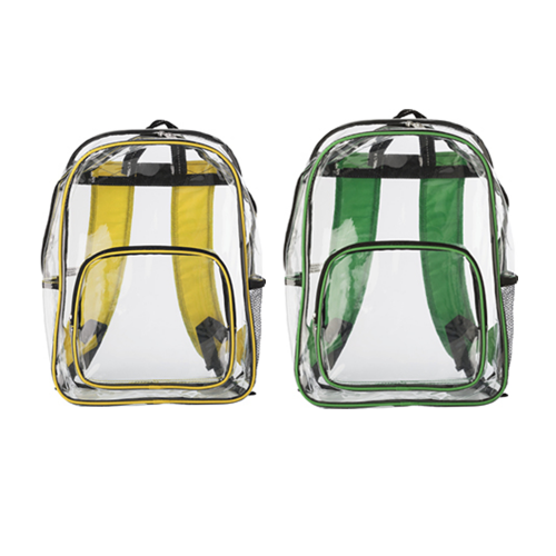 Transparent with coloured piping, large main compartment,a front zippered pocket, two mesh side pockets, and adjustable padded carry straps.