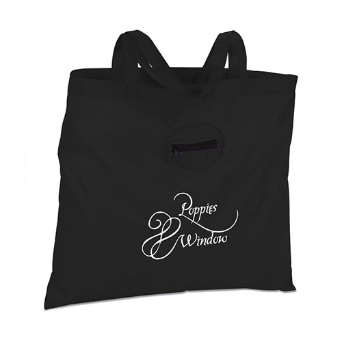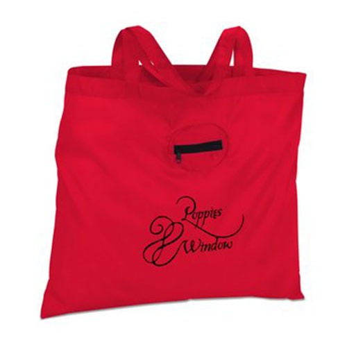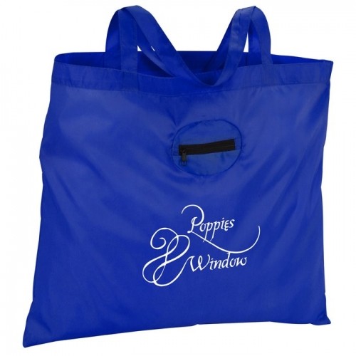Take this handy tote to tradeshows, conventions, the library or the grocery store-- it’s reusable and a great alternative to plastic bags! This 210D polyester tote is both lightweight and durable and is paired with double 21\" handles for easy transport. The large main compartment stores your books, catalogs, binders, paperwork, groceries and other personal items. When not in use, this tote gathers into a palm-sized pouch inside its own front pocket. Then, attach the tiny pouch to your zipper or key ring with the included split-ring keychain so you’ll always have a tote handy.
