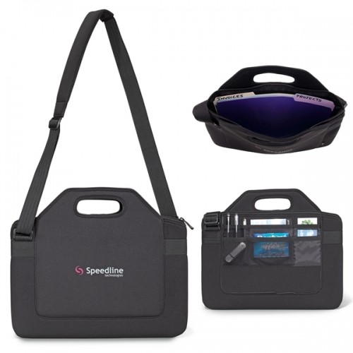 Front and rear pockets sized to fit a tablet Multi-function organizer Padded, adjustable shoulder strap with premium nylon webbing Zippered computer compartment fits most 13" laptops and 14" Ultrabooks