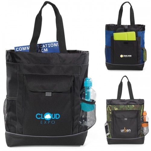 Versatile tote easily converts to a backpack by tucking handles into main compartment of tote and attaching adjustable backpack straps When used as a tote, conceal backpack straps by tucking into back pocket Front pocket with pull tab and Velcro closure (fits a tablet with a case) Large main compartment with cinch top closure Side mesh water bottle pockets