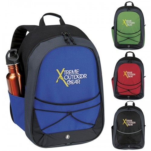 This multi-purpose sporty backpack is perfect for both travel and athletic events. Features include; stylish front pocket with cording detail, useful for holding loose items. Additional side pocket increases storage space for water bottles, media items, Zippered main compartment Front slip pocket with cord detail Side slip pocket Adjustable shoulder straps and carrying handle