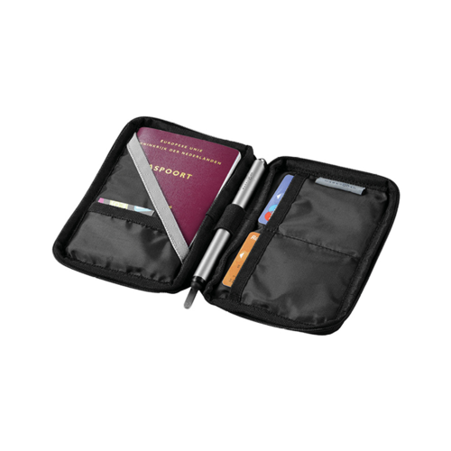 Travel wallet with zippered closure, pen loop, and many slip pockets, packed in a gift box.