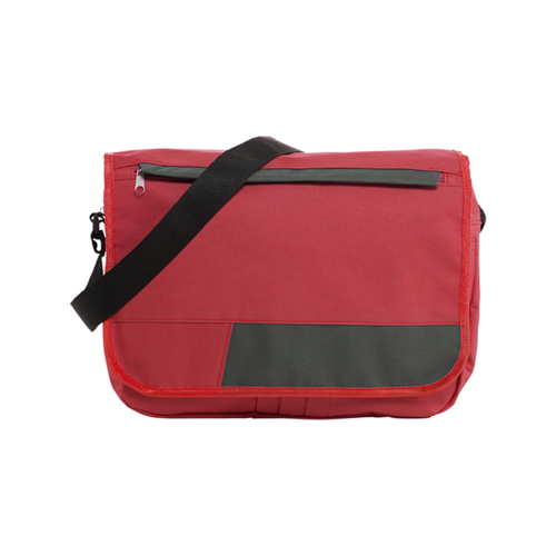 Large zippered main compartment, covered with a flap, three pen pockets underneath the flap, one quick access zippered pocket on the flap, and an adjustable shoulder strap.