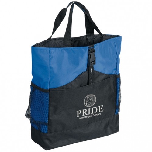 Large main compartment and open front pocket with an organizer and clip closure.