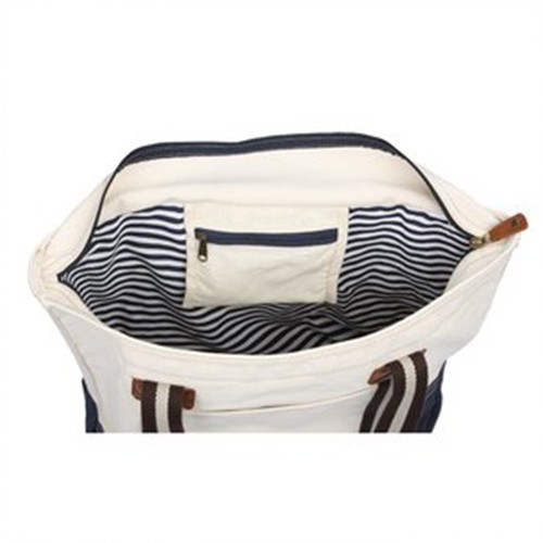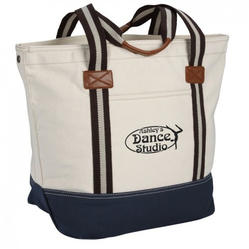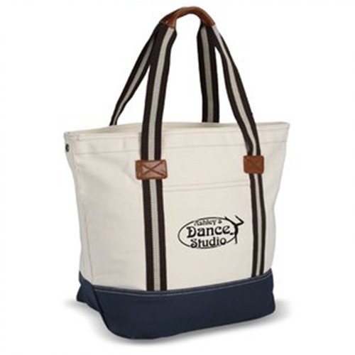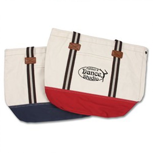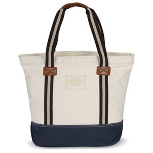 This durable fashion bag is made from 16-oz 100% flexible cotton. This inspired tote features classic styling and durable construction. Oversized, zippered main compartment keeps your things secure and prevents items from slipping out. This aesthetically pleasing bag has a fully lined striped interior. Interior zippered accessory pocket can store your keys, cell phone, pens and other small items. Keep items easily accessible in the wide front slip pocket. Classy and stylish, this tote has simulated leather handle wrap and patches. Heritage supply logo patch on back.