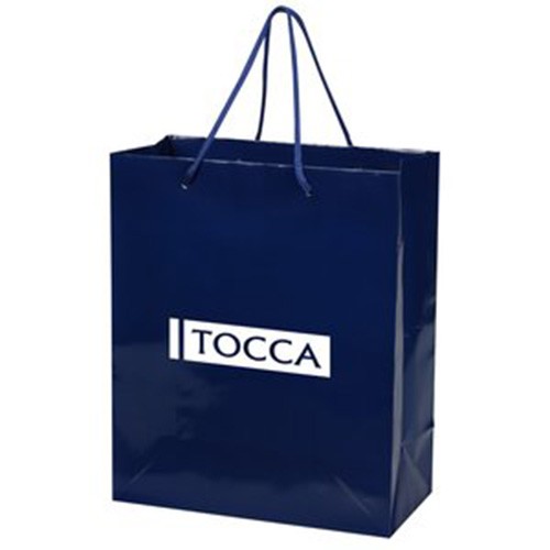 The gloss finish and fancy foil imprint of this distinctive bag gives your logo an exquisite look! This custom imprinted bag is perfect for boutiques, gift shops, specialty stores and special events. Shopping tote is made from paper material that can easily be recycled! Your logo will look great to your customers on the 128gsm gloss-laminated paper. Matching macramé handles, reinforced fold-over top and cardboard bottom insert provide classy, durable finishing touches. Additional sizes of this upscale tote are also available; check with your customer service rep for even more options.