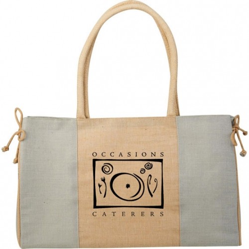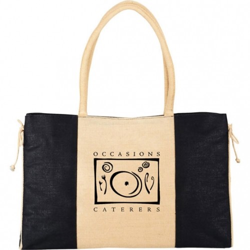• Made of natural Jute and cotton material.• Rope accent ties on both sides.• Spacious main compartment.• Main compartment features Velcro closure.• Drop handles are 9 3/4" long.