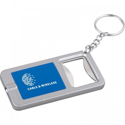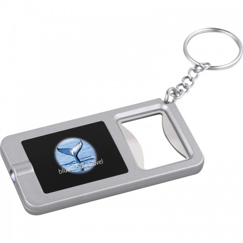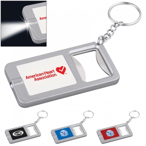 Key-Light/Bottle Opener Promotional Flashlights Keychains Single white LED light. Metal bottle opener. Metal split key ring. Push-button power on back.