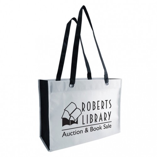 - Duo-tone tote made from 100GSM non-woven polypropylene has extra-long 28" handles for easy carrying.