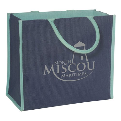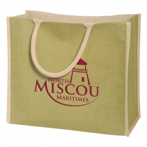 - Eco-Responsible™ natural jute tote with matching natural cotton lining, color coordinated piping and rope handles.