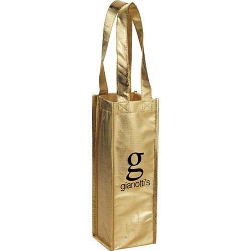 - Available in four festive metallic colors, this polypropylene wine tote makes the perfect gift!