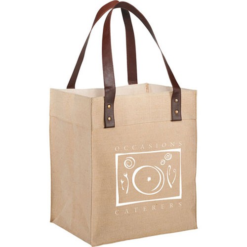 Stylish grocery or shopping tote made from a jute and cotton blend.