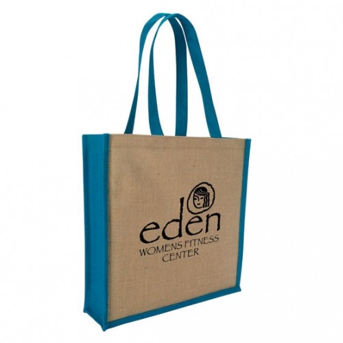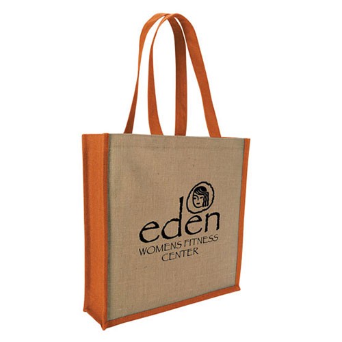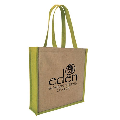 - Extra-strength tote made from laminated jute material.