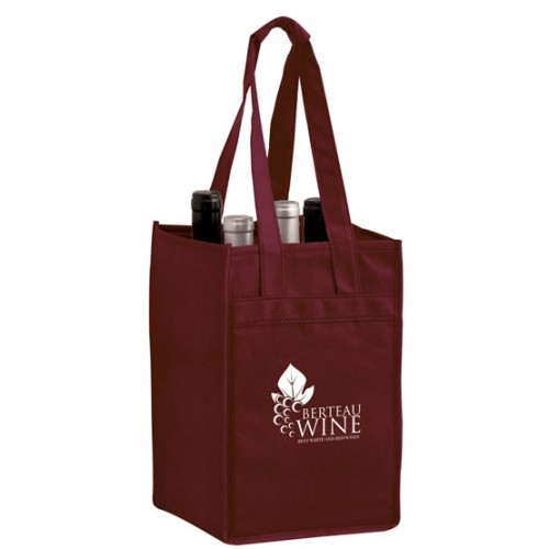 - Polypropylene wine bottle bag with stitched bottom and side seams, sewn in divider, and foam bottom.