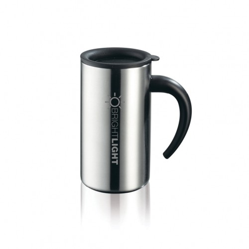 Mega-watt accent colors pop brightly against the silvertone printed travel mug.