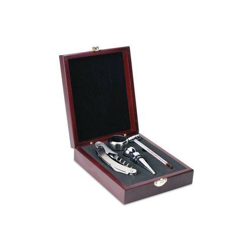 Elegant wine set presented in a nice wooden box, includes a wine stopper, corkscrew, bottle collar and a thermometer.