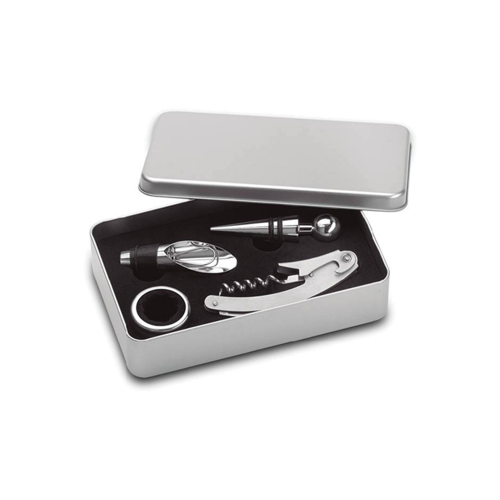 Wine set in a tin box, including bottle opener, stopper, pourer and an anti-drop ring