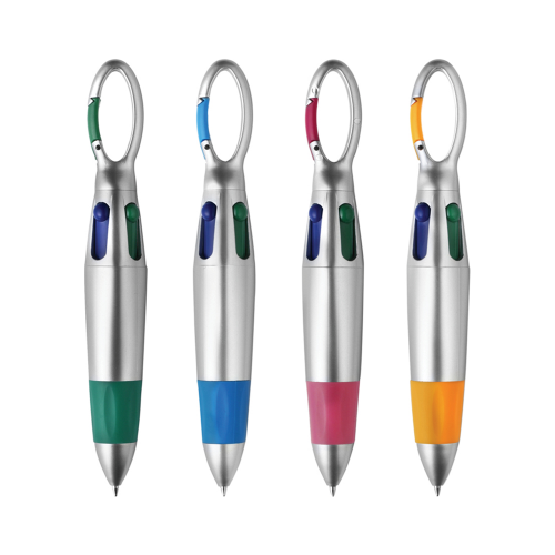 Mini multi pen, silver barrel,rubber grip, coloured trims, topped with a ring allowing attachment to lanyards or key chains.