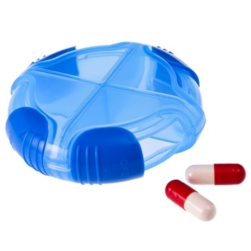 - Pill box features a top, middle and bottom compartment which are divided into smaller, segmented compartments.