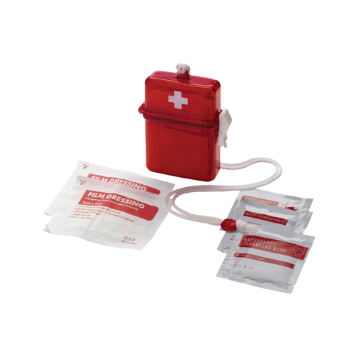 Waterproof first aid kit in a plastic box with a carry cord, including waterproof first aid kit in a plastic case with carry cord, contains two film dressings, five plasters, four alcohol prep-pads, one moist wipe, one antiseptic wipe and one anti mosquito towelette