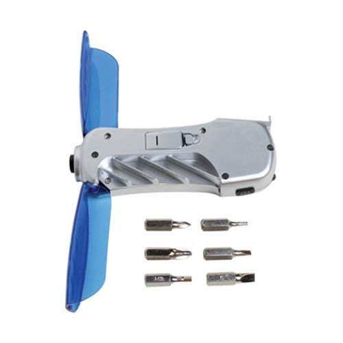 Compact tool kit, 6 interchangeable bits, built in level, built in 100 cm tape measure, and a LED