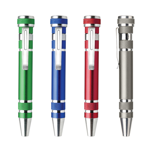Pen shaped screwdriver kit, 8 heads and a belt clip. The Handyman Pen-Style Toolkit houses eight different tools in a compact unit. Constructed of a high-grade aluminum, and affixed with a clip, this set is both durable and portable.