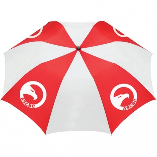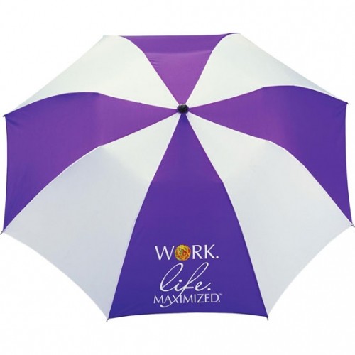 Features ergonomic matte black plastic handle with wrist strap. Two-section folding metal shaft allows umbrella to fold to 15" long. Imprint: One color only. Imprint Area: 6"W x 6"H (one panel)