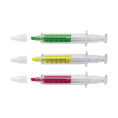 - Syringe shaped plastic neon yellow highlighters are great for medical students and hospitals.