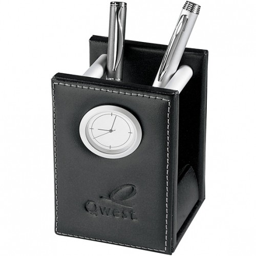 This clock adds sophistication -- and space -- to any desktop. A great two-in-one promotional product at a great price.