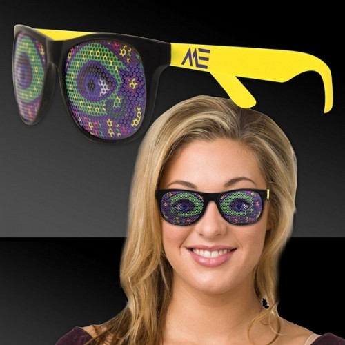See through a New pair of eyes for Mardi Gras when you wear our Unique pinhole lens neon Yellow Billboard Sunglasses. These Unique decals feature tiny pinholes that are easily looked though on our trendy black plastic frames boasting bold and bright Yellow arms. Imprinting on the arms only.