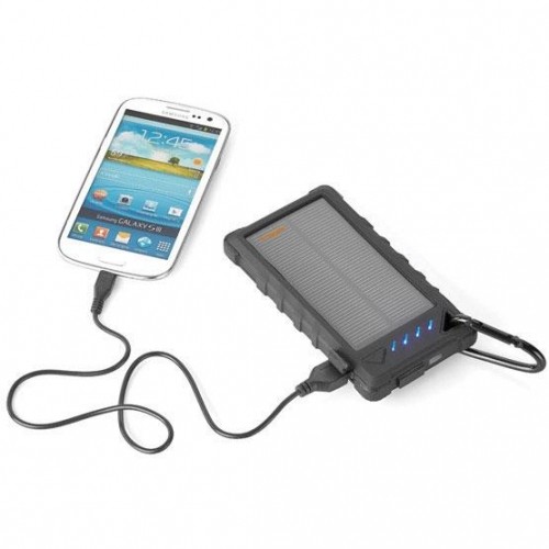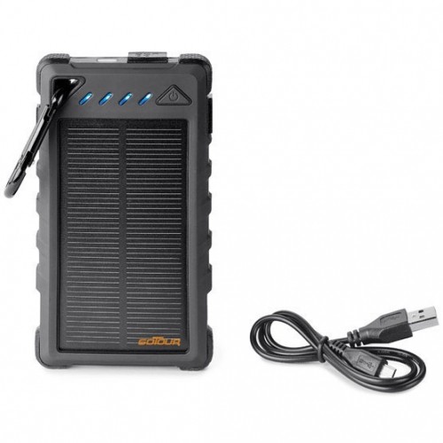 Its solar panel allows it to be charged by the sun while you're outdoors and can alternatively be charged using a micro-USB/USB cable and a power source.