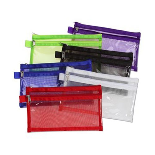 - Made with mesh and vinyl, the zippered pouch will last semester after semester.