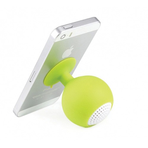 Mini size ball shaped silicone and PVC speaker and phone stand in one, Suction cup attachment to the back of yourphone - just lean, plug-in and listen!