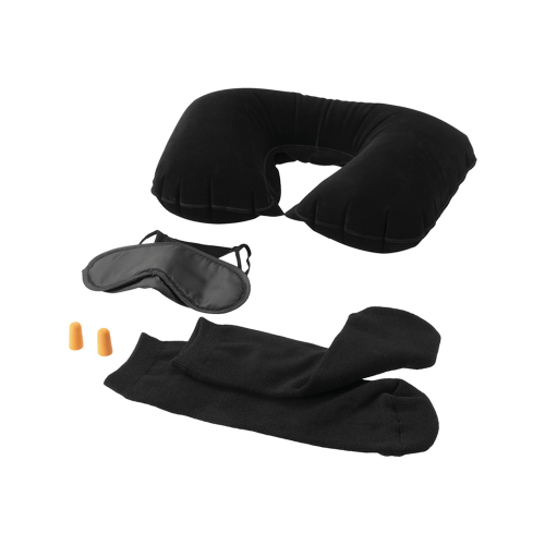 Complete 4-piece travel set in a clear pouch: inflatable U-shaped neck pillow, light-blocking eye mask with elastic strap, soft socks, and foam earplugs.Materials: Flocked velour pillow cover with PVC/vinyl inflatable core; soft knit socks; foam plugs; PVC pouch.Color: Black set in transparent pouch.Features: Packs flat, reusable, easy to clean; ideal for planes, trains, buses, road trips, and lounges.Branding: Add your logo to the pouch (pad print or screen print). Custom kitting and bulk gifting available.Target: Airlines, travel agencies, corporate wellness, conference swag, employee travel gifts, VIP kits.