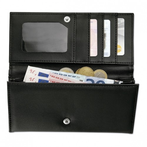 This elegant black leather travel wallet combines classic design with practical organization. Featuring multiple card slots, a transparent ID window, bill compartments, and a secure coin pocket, it keeps essentials neatly arranged. The zippered inner pocket and snap button closure provide added security, making it ideal for business travel, corporate gifting, or promotional giveaways. Perfect for executives, clients, and employees, this wallet can be customized with your company logo for brand visibility. Durable leather construction ensures long-lasting use while maintaining a sleek, professional appearance.