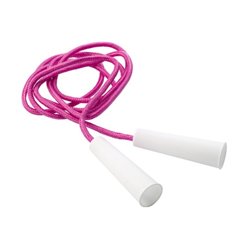 Materials: Braided nylon/polyester rope; ABS plastic handles.Design: Lightweight pink cord with smooth cylindrical grips for comfort; braided rope resists tangles; portable for on-the-go training.Features: Durable, high-visibility color, simple for all ages.Use cases: Cardio and endurance, warm-ups and HIIT, school PE, youth fitness, event giveaways, corporate wellness.Customization: Pad print or full-color logo on handles; 1-2 positions; PMS color matching on request; bulk packaging.Target: Gyms, schools, wellness programs, sports camps, brand activations.