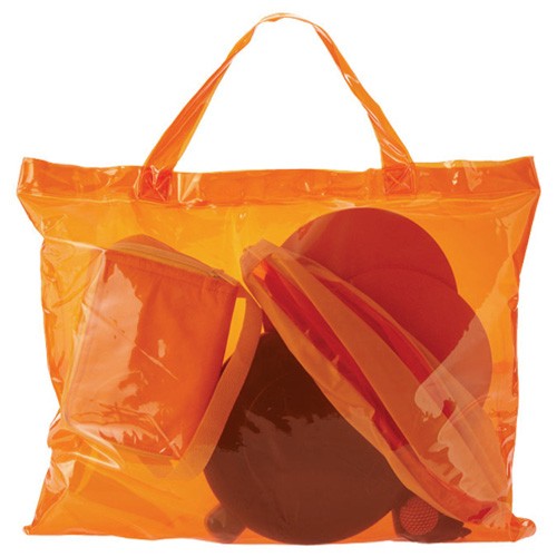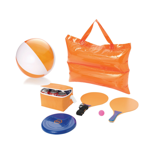 What's included: inflatable beach ball (orange/white), two paddle bats (beach rackets) with ball, plastic flying disc, compact 6-can cooler, all packed in a translucent orange PVC tote/pillow bag with carry handles.Materials: Glossy transparent PVC/vinyl.Features: Durable tote for wet gear, cooler keeps drinks cold, fun beach games for instant engagement.Use cases: Beach days, pool parties, summer festivals, corporate outings, resort or travel promotions.Branding: Screen or pad print on tote, disc, paddles, cooler and beach ball; single or multi-color logo.Ideal for: Brands, agencies, hospitality, travel, HR gifts, field teams, event activations.