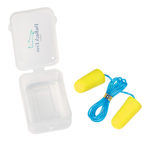 Soft foam corded ear plugs in compact case, ideal for travel, events, and giveaway