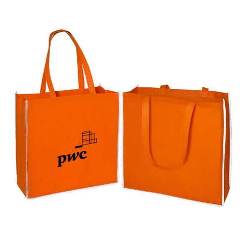 Materials: 100 GSM non-woven polypropylene with fabric-like texture.Safety: Reflective piping increases night visibility, reflecting headlights up to 300 feet.Design: Boxy, gusseted tote with reinforced seams, open-top access, long 25 1/2" shoulder handles.Branding: Large imprint areas on both sides to feature your logo.Colors: Orange, Blue, Red. Use cases: trade shows, conferences, retail giveaways, groceries, corporate swag. Ideal for brands promoting sustainability and safety.