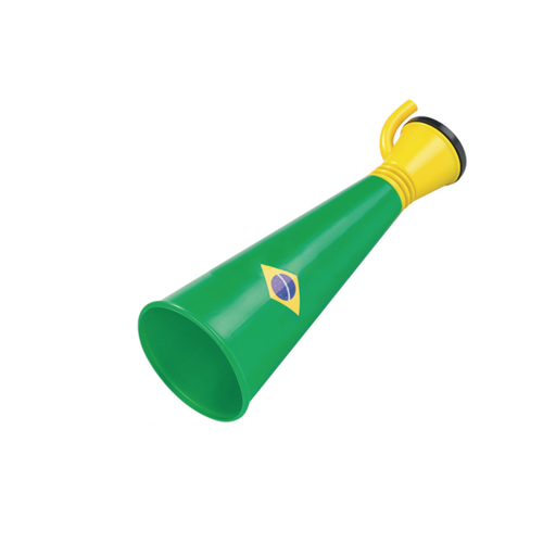 Material: Glossy ABS/PP plastic; rubber ring at mouth/end for comfort.Visual: Cone-shaped stadium horn in Brazil colors - green body with yellow mouthpiece; Brazil-themed accent.Also known as a vuvuzela cheering trumpet.Features: Loud sound output, lightweight and durable, finger/lanyard loop near mouthpiece, large flat sidewall for logo imprinting.Use cases: Stadium cheering, soccer and watch parties, school spirit rallies, parades, festivals, outdoor celebrations.Customization: Add your logo to the flat sidewall for bold branding; bulk ordering available.Ideal for: Sports marketers, teams, schools, event sponsors, fan clubs, retailers.