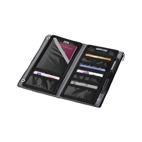 This sleek, promotional travel wallet combines style and function for business travelers. Crafted from durable synthetic fabric, it features a snap button closure, zippered side pockets, multiple inner slip pockets, card slots, a dedicated passport pocket, pen holder, and compact design for easy carrying. Ideal for organizing travel documents, tickets, and credit cards, it comes packaged in a gift box for premium presentation. Available in black or gray, it can be customized with your company logo, making it a perfect corporate gift or branded giveaway for clients, employees, or event attendees.